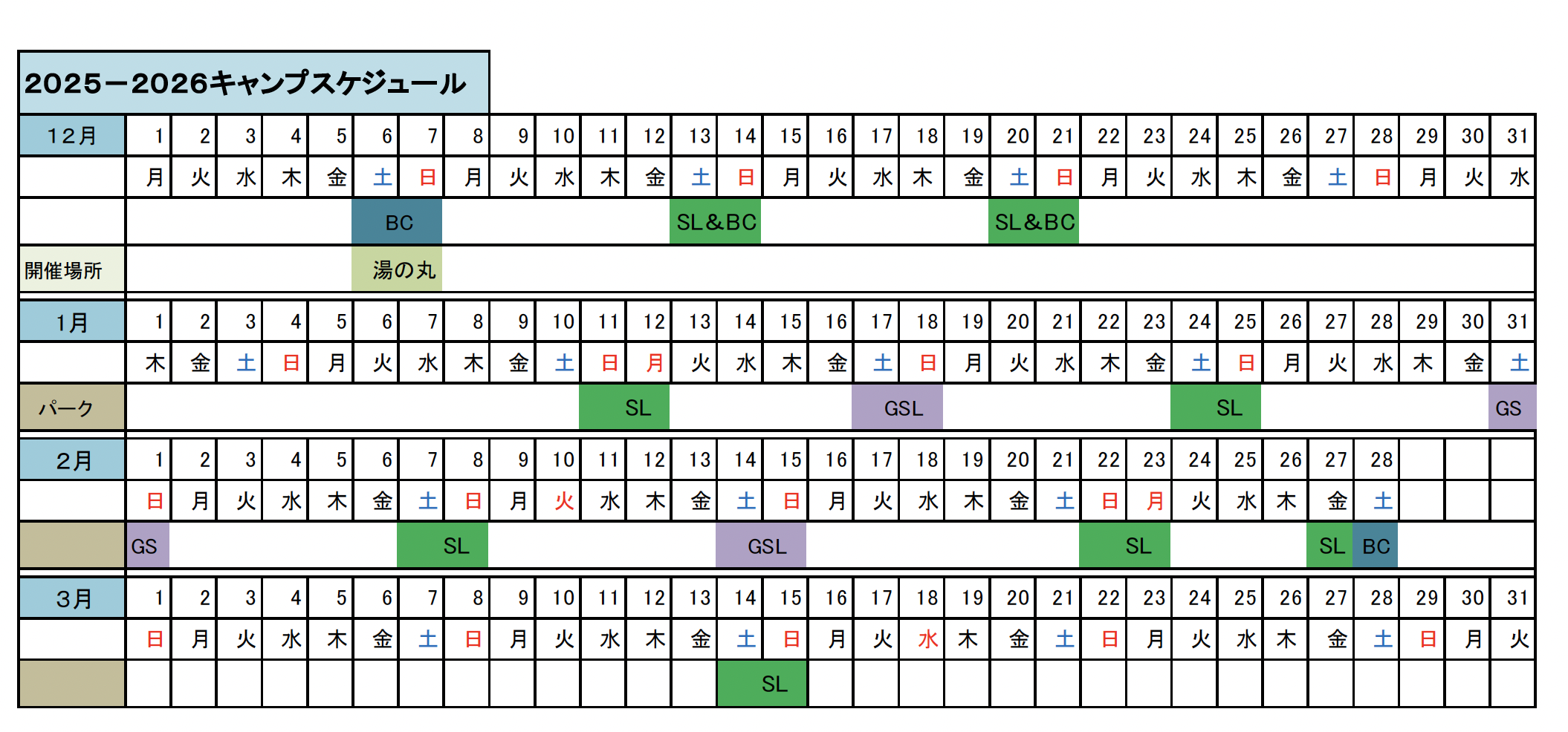 Quality·Seven スキーキャンプの開催カレンダーです。拡大表示するには、画像をクリックしてください。また、こちらからPDF形式の開催カレンダーもダウンロードできます。